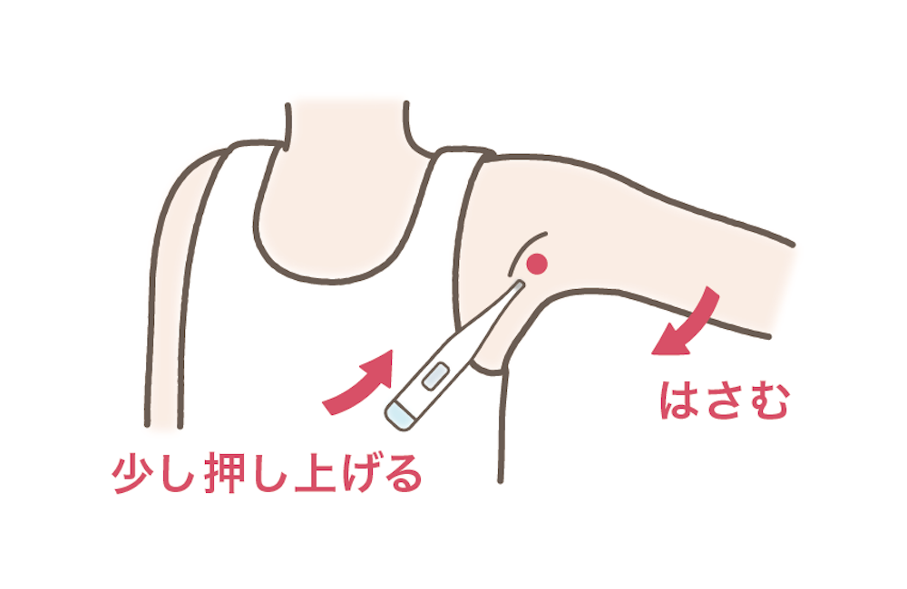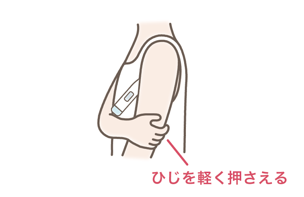 ワキのくぼみの真ん中に、斜め下方向から体温計の先を押し上げるようにしてあてて、腕ではさみます。