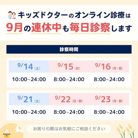 キッズドクターのオンライン診療は、9月の連休中も毎日休まず診察いたします。オンライン診療の診察時間は以下のとおりです。